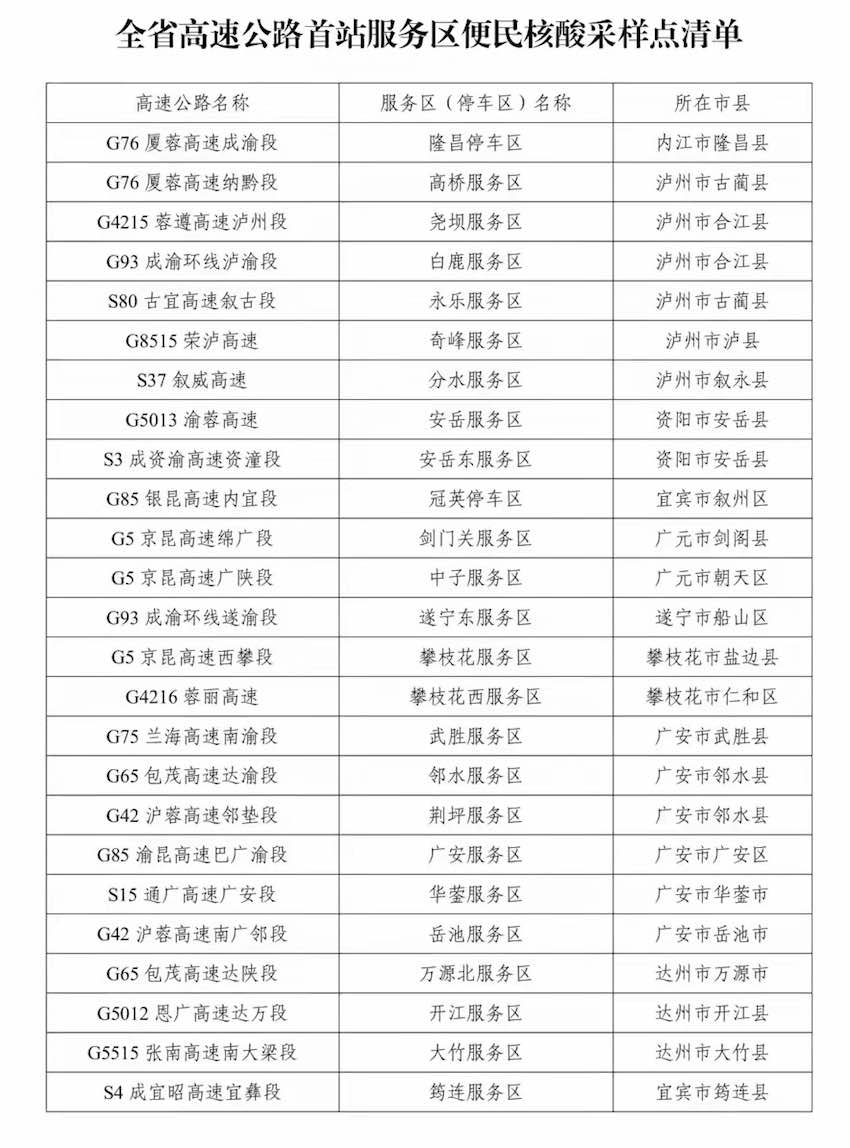 答:在25個入川高速公路的第一個服務區,均設置了便民核酸采樣點,省外來車司乘人員可在這些點位免費做核酸,后續在駛離高速公路出站口時,不再重復檢測。