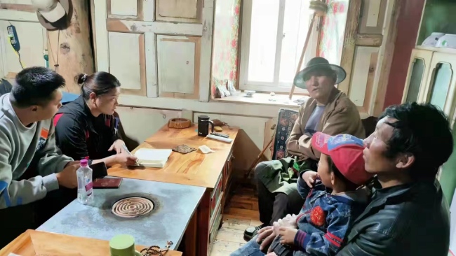 鄉城縣然烏鄉駐村工作隊隊員益西曲初、黃河到然烏鄉克麥村宣傳并制定村規民約,特別“約定”不得采挖紅景天。四川省應急管理廳供圖