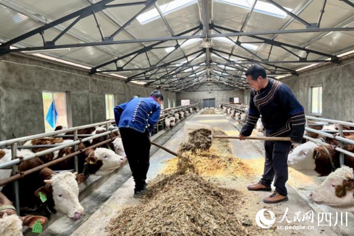 致富帶頭人洛古有格(右)在肉牛養殖場和村民一起勞作。人民網 朱虹攝