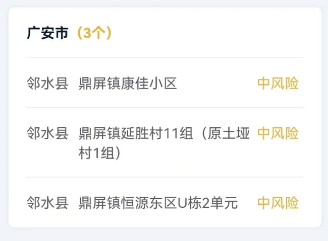 目前,廣安市共有3個中風險地區(如下圖),其余地區均為低風險地區。