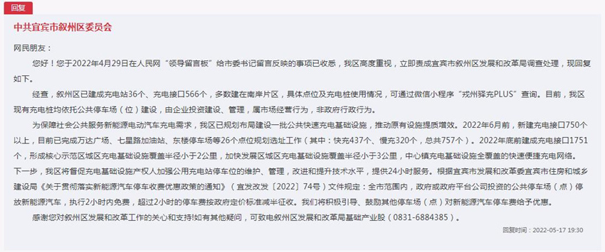 收到網友留言后,中共宜賓市敘州區委員會立即責成宜賓市敘州區發展和改革局調查處理。結果顯示:敘州區已建成充電站36個、充電接口566個,多數建在南岸片區,具體點位及充電樁使用情況,可通過微信小程序“戎州驛充PLUS”查詢。目前,敘州區現有充電樁均依托公共停車場(位)建設,由企業投資建設、管理,屬市場經營行為,非政府行政行為。