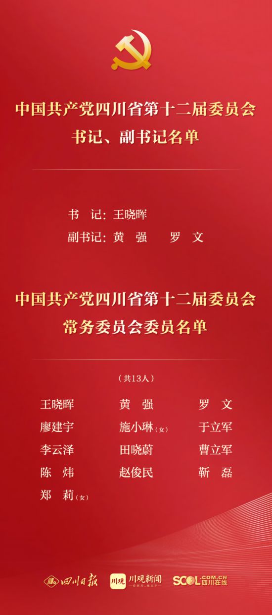 權威發布丨王曉暉當選四川省委書記 新一屆四川省委書記、副書記、常委名單
