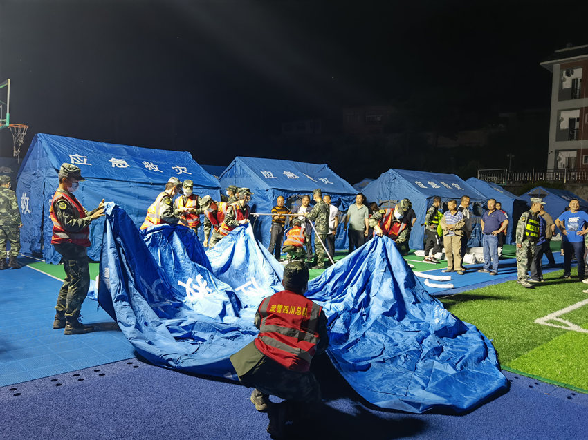 “我們接到命令后,第一時間趕到現場,目前已經工作近6個小時了,我們希望快一點將所有帳篷搭建完畢,讓受災群眾早點住進帳篷里休息!彼拇ㄊ∩窒揽傟犔厍诖箨牬箨犻L高吉永說,雖然很累,但是隊員們的積極性很高。
