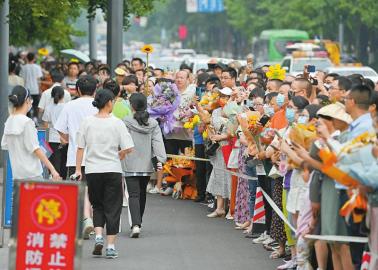 6月8日下午,鹽道街中學考點外,家長們手捧鮮花迎接考生走出考場。 四川日報全媒體記者 何海洋 攝