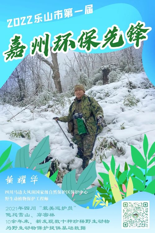 近日的“美麗中國,我是行動者”2022年樂山市第一屆“嘉州環保先鋒”評選活動中,四川馬邊大風頂國家級自然保護區保護中心野生動植物保護工程師黃耀華成功入選。他是為生態環境保護而生的最美行動者,他把滿腔熱血青春奉獻給了大風頂保護區。2021年,他被四川省林業和草原局、阿拉善SEE天府項目中心、成都天府新區愛思益生態保護中心聯合授予“最美巡護員”稱號。
