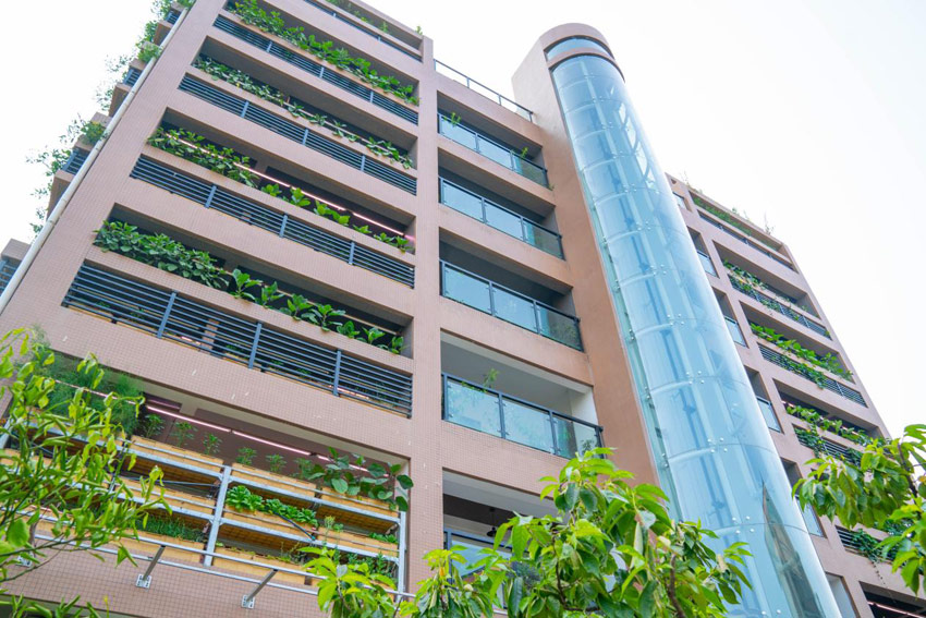 在這座“樣板樓”中,樓下的魚池、樓上的果蔬、樓前的樹椅、樓里的新式污水處理系統……無不體現著與傳統樓房的不同。走進每一層,似乎都走進了一個家庭農場,里邊種植的時令蔬菜和水果,讓人心動和欣喜。這是“智慧碳中和生態價值系統”顛覆傳統建筑模式帶來的新變化。