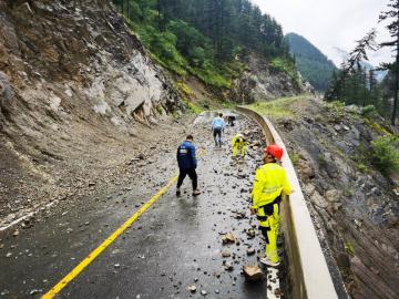 搶險人員正在九寨溝縣大錄鄉公路現場觀察山體狀況。受訪者供圖