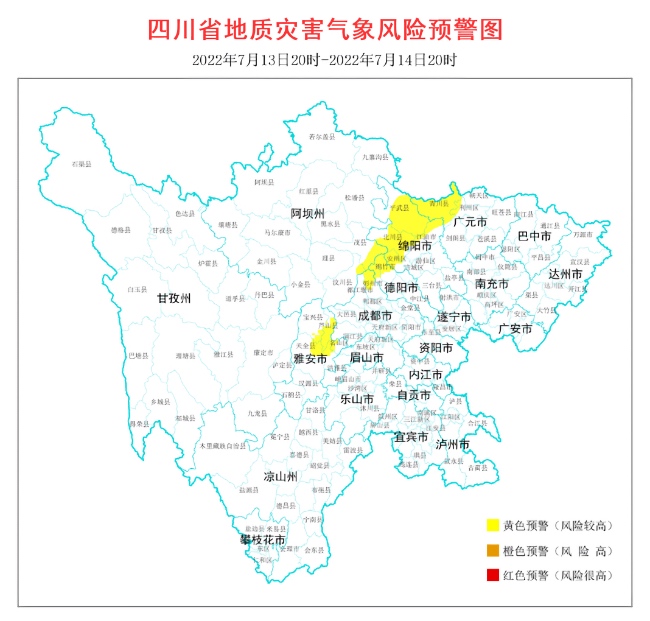 根據四川省地質環境條件,結合四川省氣象臺天氣預報情況,四川省地質災害指揮部辦公室發布7月13日20時至7月14日20時全省地質災害氣象風險預警。