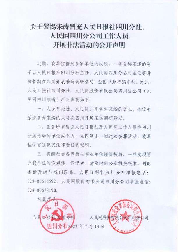 近期,我單位接到多家單位的反映,一名自稱宋濤的男子以人民日報社四川分社主任、人民網四川分公司主任等身份長期在四川開展采訪調研活動,企圖以此行騙牟利。為此,人民日報社四川分社、人民網股份有限公司四川分公司(人民網四川頻道)嚴正聲明如下: