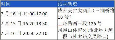 為方便市民排查風險軌跡,現將成都市本輪本土疫情病例活動軌跡整理如下,請市民朋友們對照自查。如與以下活動軌跡有重疊,立即向社區和單位(或居住的酒店)報備,三天內接受兩次核酸檢測(間隔24小時),期間做好個人防護,不聚會、不聚餐。如有疑問,請撥打12345咨詢。