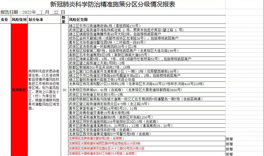 7月22日0時起,錦江區錦東庭園14-15棟,武侯區百花公寓1-2棟,天府新區麓湖生態城瀾語溪岸1棟由高風險區降為中風險區;錦東庭園1-13棟(含底商),武侯區人民南路四段15號,天府新區麓湖生態城瀾語溪岸2-3、5-9棟由中風險區降為低風險區。
