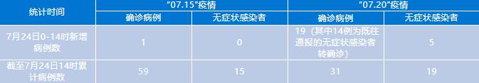 “07.20”疫情新增本土確診病例19例(其中14例為既往通報的無癥狀感染者轉確診),新增本土無癥狀感染者5例。截至24日14時,本起疫情累計報告本土確診病例31例、本土無癥狀感染者19例。