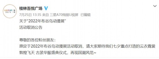 7月25日,桂林吾悅廣場官微發布聲明,稱原定舉辦的2022年布谷鳥動漫展活動取消。