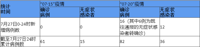 “07·15”疫情無新增本土確診病例,無新增本土無癥狀感染者。截至27日24時,本起疫情累計報告本土確診病例61例,本土無癥狀感染者15例。