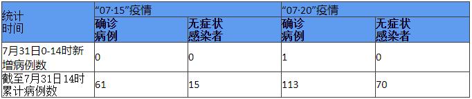 “07·20”疫情新增本土確診病例1例,無新增本土無癥狀感染者。截至31日14時,本起疫情累計報告本土確診病例113例,本土無癥狀感染者70例。