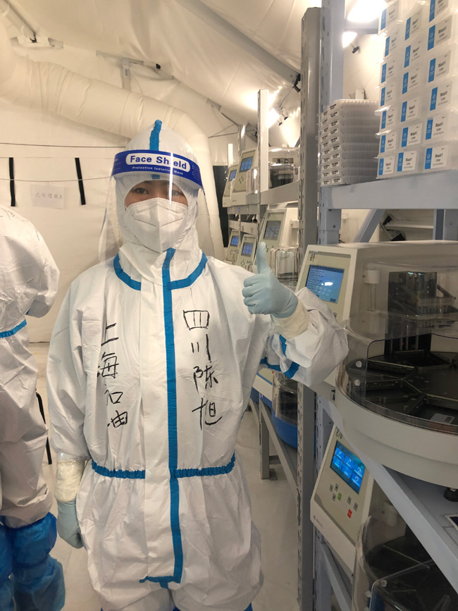 4月3日,她隨四川核酸檢測隊抵達上海,和其他19名宜賓隊成員一起負責上海浦東區解碼氣膜實驗室。其中的工作,包含標本到實驗室的整個流程,從接收標本、消毒、掃碼上機、加樣本、提取核酸、擴增到出具報告,環環相扣,容不得一點馬虎。陳旭在實驗室主要負責加樣工作,需要一直重復相同的動作,最多的一次加樣達到2340管,以至于手指磨出了血、磨起了繭。