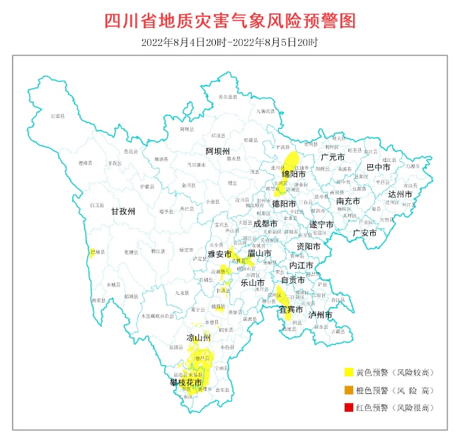 根據四川省地質環境條件,結合四川省氣象臺天氣預報情況,四川省地質災害指揮部辦公室發布8月4日20時至8月5日20時,全省地質災害氣象風險預警。