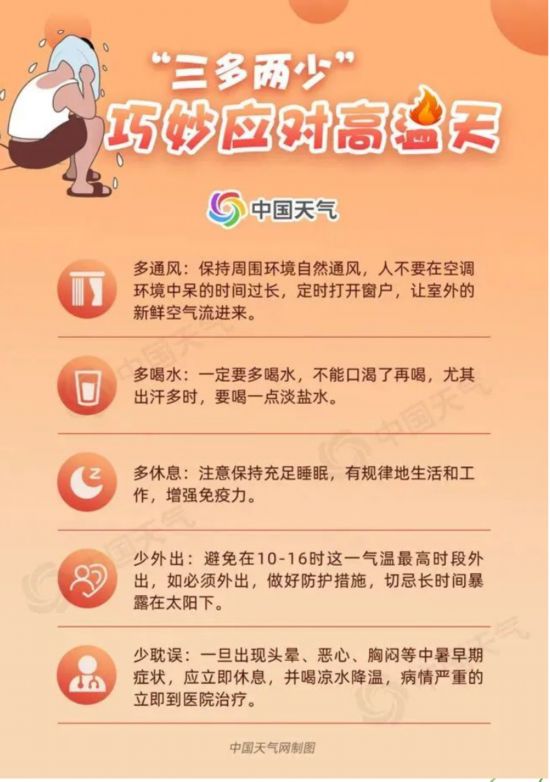 氣象部門建議,各地各部門要切實做好持續性高溫天氣條件下的各類安全生產風險隱患研判、管控與應對,加強水、電、氣等要素保障,做好防暑降溫、水電調配、農業抗旱、森林防火和臭氧污染防控等工作。午后高溫時段應盡量避免戶外活動,注意用電用火安全。