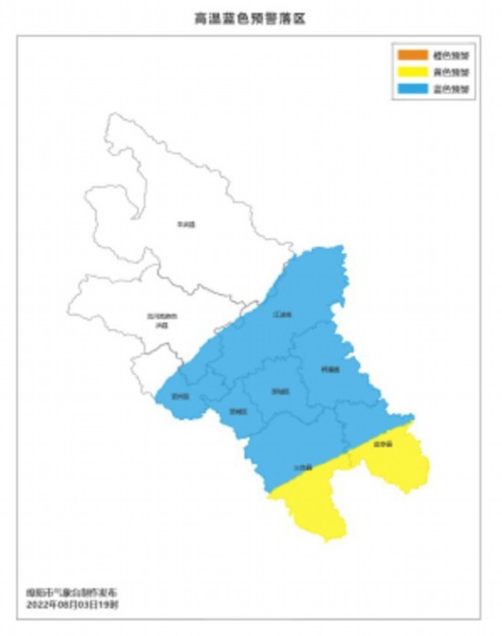 ▲ 綿陽市氣象臺高溫藍色預警生效中: