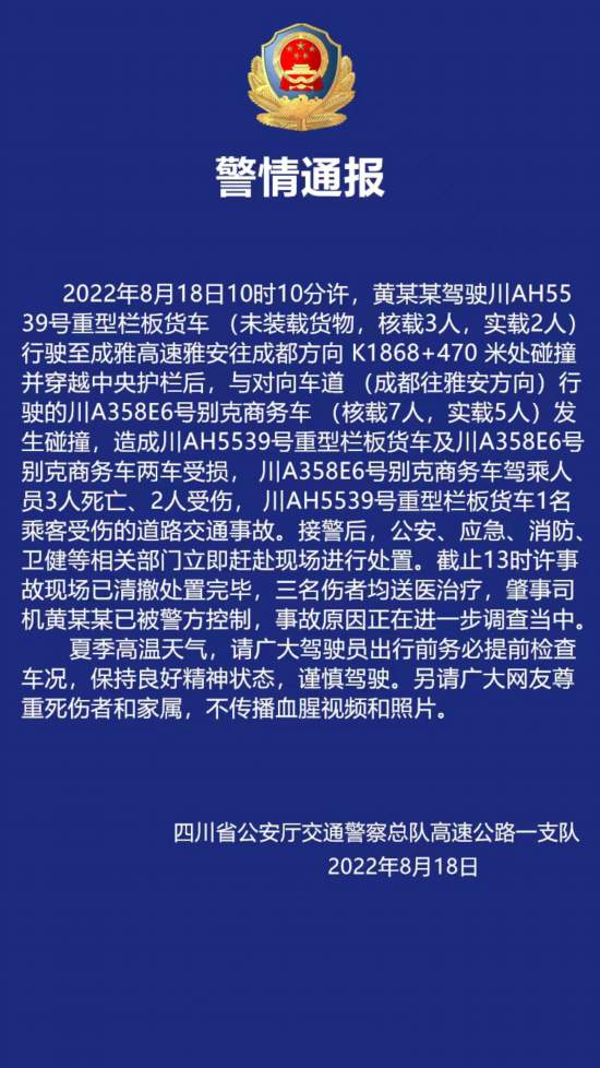8月18日,四川省公安廳交警總隊高速公路一支隊發布通報稱:8月18日10時10分許,黃某某駕駛AH5539號重型欄板貨車(未裝載貨物,核載3人,實載2人)行駛至成雅高速雅安往成都方向K1868+470 米處碰撞并穿越中央護欄后,與對向車道(成都往雅安方向)行駛的川A358E6號別克商務車(核載7人,實載5人)發生碰撞,造成重型欄板貨車及別克商務車兩車受損,別克商務車駕乘人員3人死亡、2人受傷,重型欄板貨車1名乘客受傷的道路交通事故。
