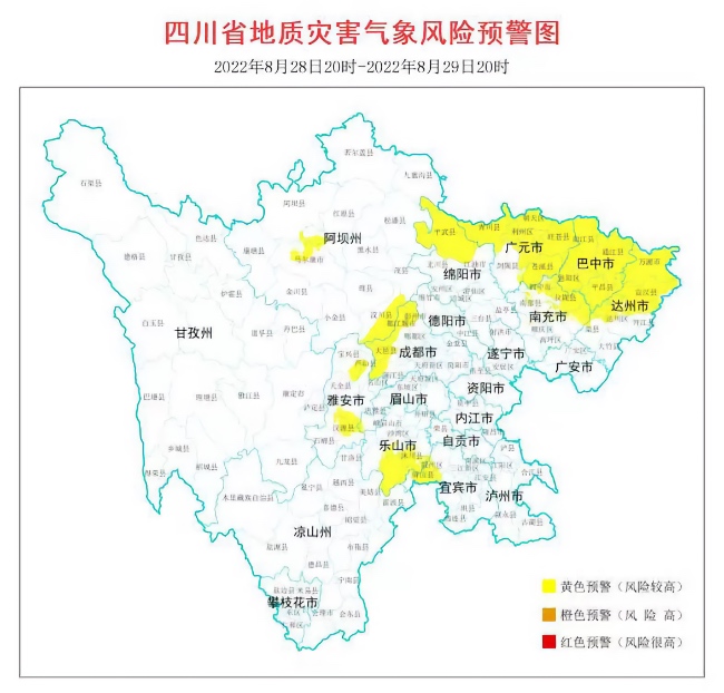結合四川省氣象臺天氣預報情況,四川省地質災害指揮部辦公室發布8月28日20時至8月29日20時,全省地質災害氣象風險黃色預警。