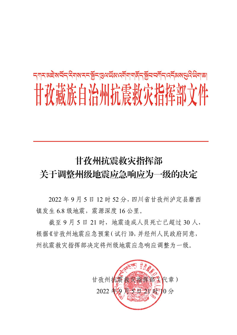 截至9月5日21時,地震造成人員死亡已超過30人,根據《甘孜州地震應急預案(試行)》,并經甘孜州人民政府同意,甘孜州抗震救災指揮部決定將州級地震應急響應調整為一級。