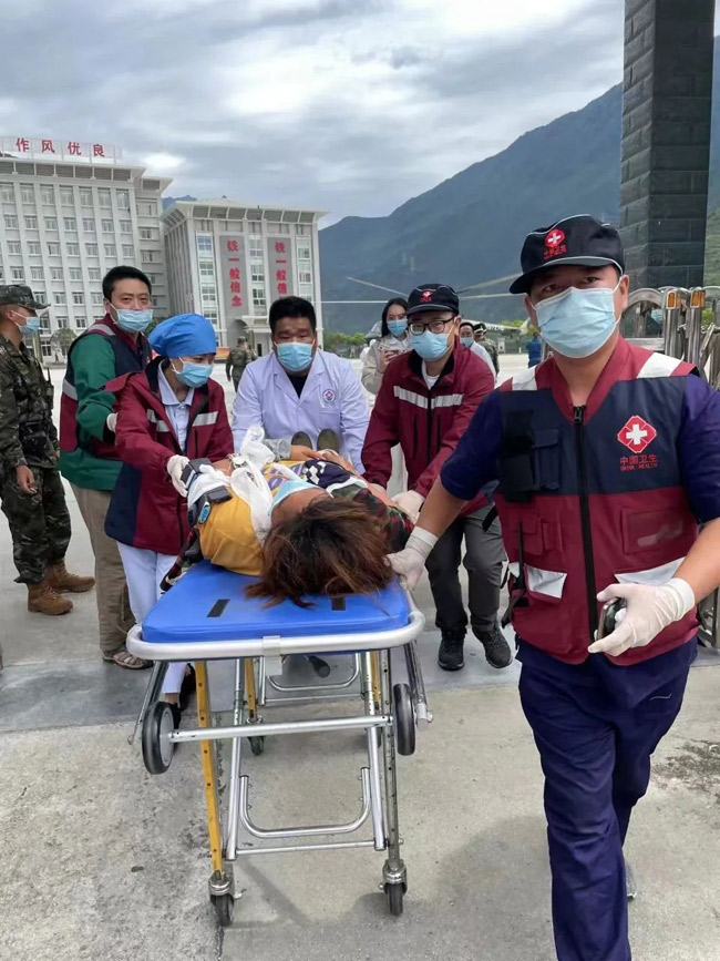 四川省骨科醫院救援隊根據災區情況,兵分兩路,一隊留守瀘定縣人民醫院繼續開展救治工作,另一隊趕往災情最嚴重的磨西鎮進行救援。9月6日早晨,小分隊與西南醫科大學附屬中醫醫院匯合,在瀘定縣直升機臨時停機坪對傷員進行初步處理和分診,并根據傷情輕重緩急,將傷員轉運至甘孜州人民醫院、瀘定縣人民醫院、雅安市人民醫院等醫院進行進一步救治。