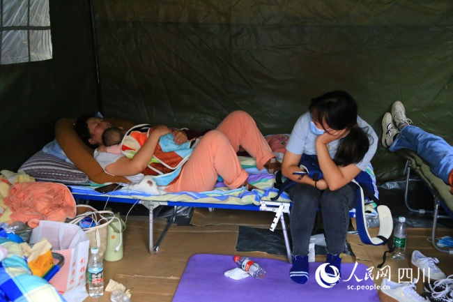 在安置點休息的徐璐(左)。人民網 朱虹攝