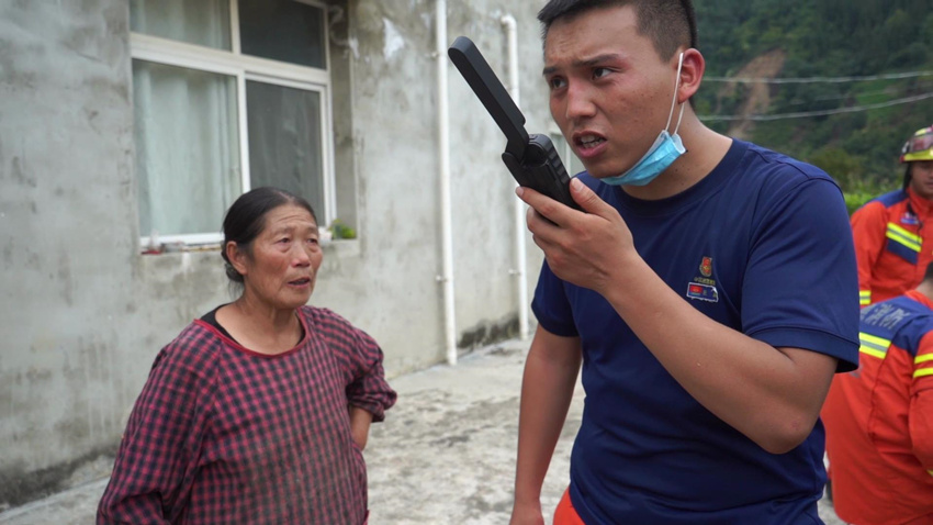 “我是消防員,你爸媽讓我給你說一聲他們平安,現在她給你講話?!毕绬T拿著衛星電話向村民提醒。大娘終于和家人通上地震發生后的第一通電話,得知家人平安,不禁淚痕滿面。