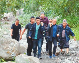 9月8日,在四川省甘孜州瀘定縣磨西鎮附近,人們將一位從磨子溝村疏散出來的受傷人員抬出。 新華社記者 沈伯韓 攝