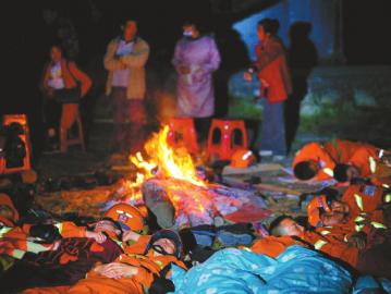 9月6日晚,森林消防員轉移完受困群眾,在磨子溝村短暫休整。他們把濕了的衣服、襪子烤干。