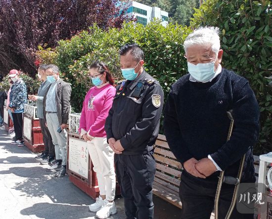 在康定市鄰你超市,12時52分,在商場里購物的消費者停下腳步,商場里的員工也在自己工作區域內排成整齊的隊伍,當警報聲響起,全場消費者、所有員工一起低頭默哀。
