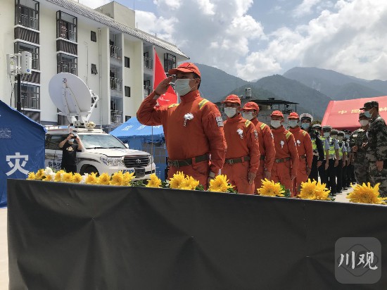 9月12日12時52分,瀘定縣得妥鎮政府,防空警報鳴響,100余名各界群眾向“9·5”瀘定6.8級地震遇難同胞默哀。他們有奮戰在救援一線的解放軍戰士、武警戰士、消防隊員、公安民警、醫護人員等,有從各地支援得妥的志愿者,也有參與自救互救的受災群眾。