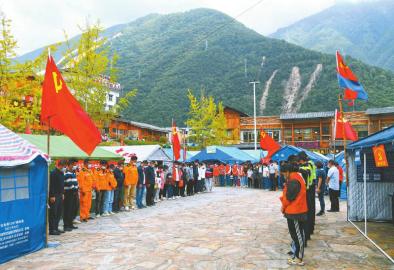 9月12日中午,在石棉縣城北民族團結廣場,救援部隊、醫護人員、基層干部、志愿者和基層群眾代表敬獻鮮花,表達對地震遇難同胞的哀思。四川日報全媒體記者 楊樹 攝