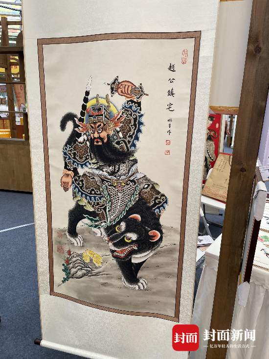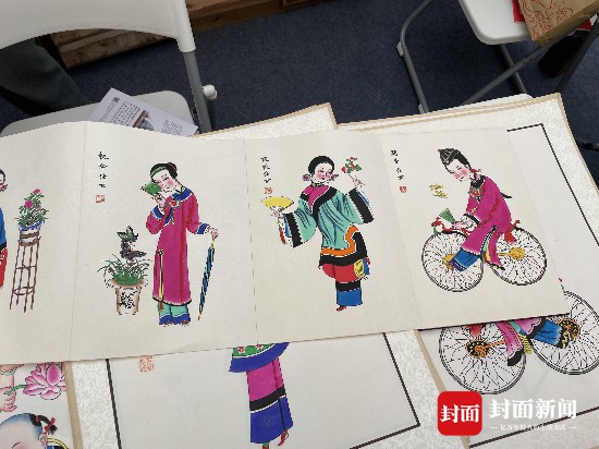 在展廳,綿竹年畫因為其絢麗的色彩吸引了不少觀眾。展臺上以福娃和仕女圖居多,年畫中的人物神態各異,顏色也不盡相同。作者李明生介紹,畫一幅年畫快則兩個小時,如果要完成大幅作品,可能要花上十幾天甚至一個月。