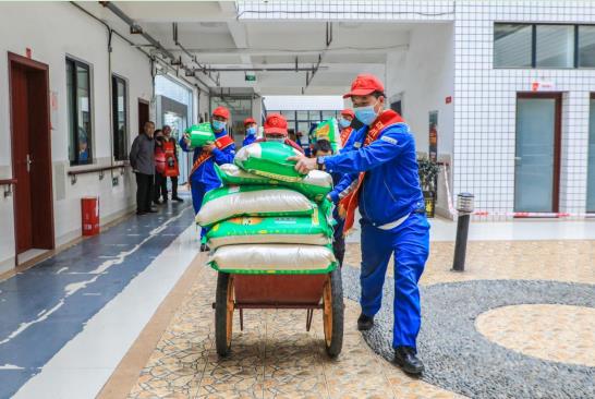 四川石化公司青年志愿者搬運米面糧油等生活物資。楊尚陶攝