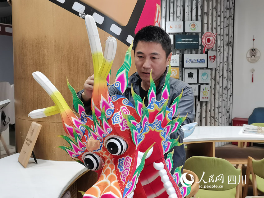 研究結構,研究圖案,這是做風箏的必修課。但是鄧靜更多的心血,用在研究風箏所蘊含的文化上。他研制的風箏往往造型獨特,一百個風箏組成的中華巨龍、成都文旅標志太陽神鳥等等造型里包含著深刻的文化含義。