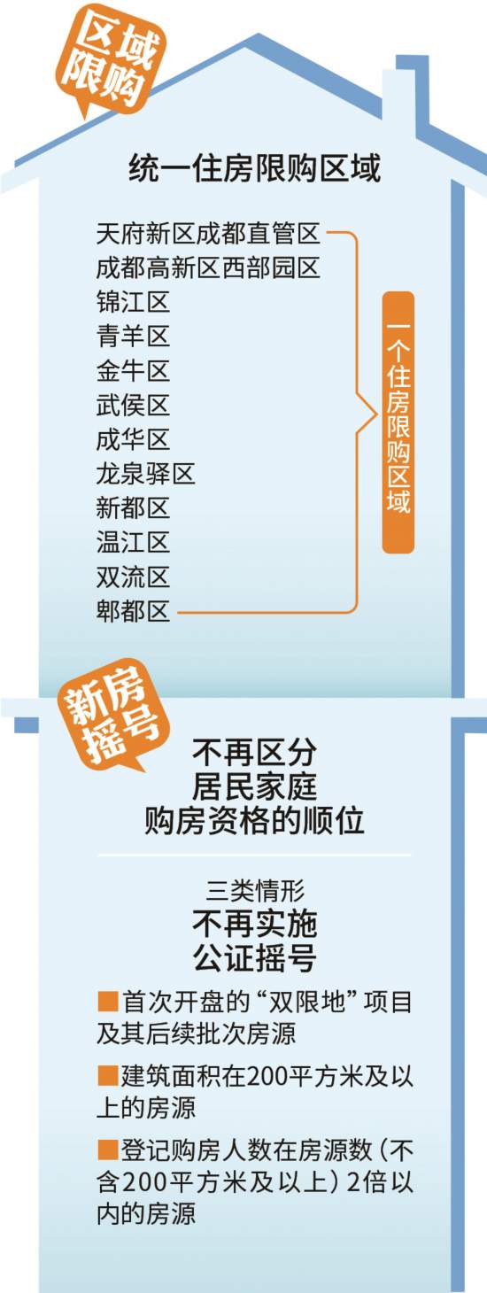 措施提出,將天府新區成都直管區、成都高新區西部園區、錦江區、青羊區、金牛區、武侯區、成華區、龍泉驛區、新都區、溫江區、雙流區、郫都區統一為一個住房限購區域,具備該區域內任一區購房資格的居民家庭以及具備成都高新區南部園區購房資格的居民家庭,均可在該限購區域內購買住房。該區域購房套數、戶籍社保年限等住房限購要求保持不變。