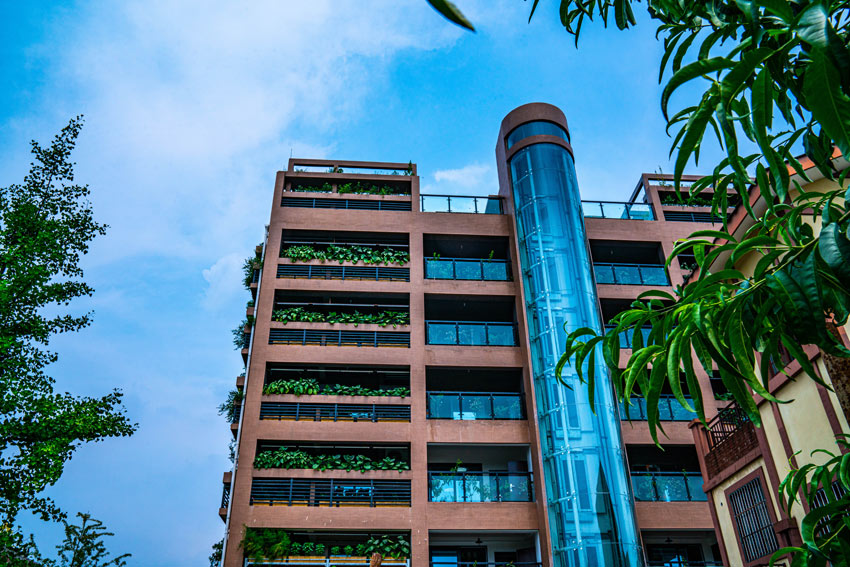 從遠處望去,這樓好像是一棵大樹,身體充盈著生命的青綠色。走到近處看,才發現它是一個神奇的生態系統:占地少卻造“地”多,住樓房卻有菜園,居城市卻入“氧吧”,生活美卻無垃圾……空中菜園可以種菜,可以種花,可以種水果,還可以種藥材。種菜美了口腹,種花美了心情,種水果美了腸胃,種藥材美了人生,人們感嘆:原來生活真的可以更美的。