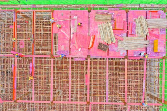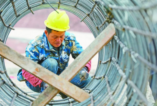 龍女湖中學項目建設現場,工人在焊接鋼筋籠。