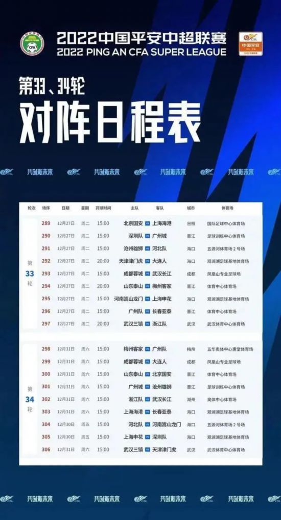 根據中超聯賽官方公布的賽程安排,2022賽季中超聯賽第34輪比賽(聯賽收官戰),將于12月31日(本周六)下午3時開打。