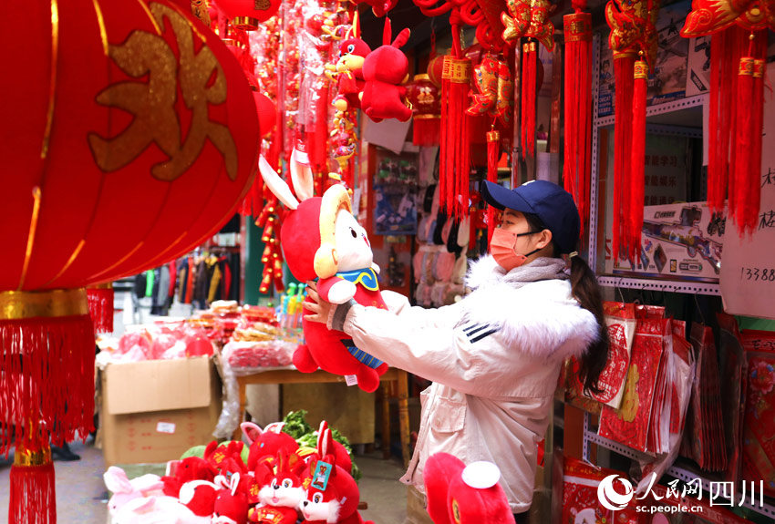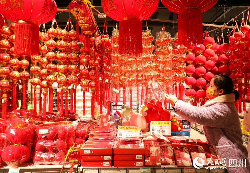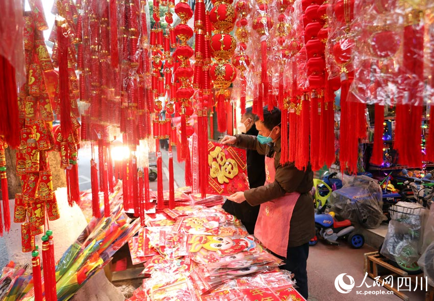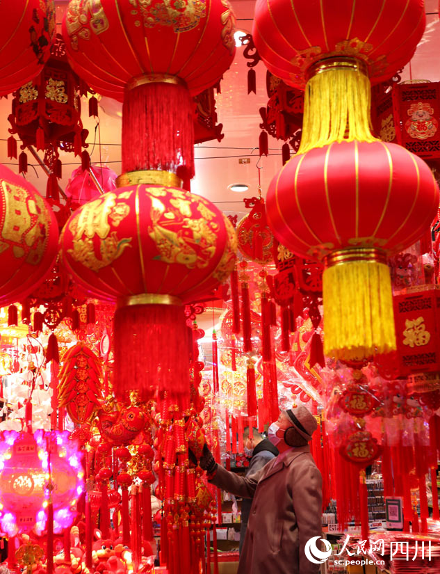 人民網成都1月12日電 春節將至,四川省眉山市仁壽縣的文化年貨市場日漸紅火。市民紛紛選購、置辦紅燈籠、春聯、福字等,各種新春文化年貨俏銷。大街小巷掛滿了新春裝飾品,古城春意撲面而來。(劉海天、潘建勇)