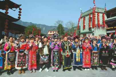 身著傳統民族服裝的羌族群眾臉上洋溢著幸福的笑容。四川日報全媒體記者何海洋攝