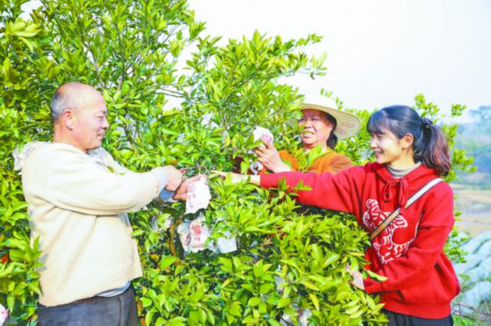 晚熟柑桔種植基地業主胡紅梅(右)與村民一起采摘大雅柑。