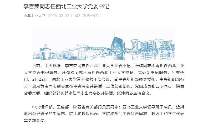 2月22日,據西北工業大學官方微信公眾號消息,日前,中央批準:李言榮同志任西北工業大學黨委書記;張煒同志不再擔任西北工業大學黨委書記職務;汪勁松同志不再擔任西北工業大學校長、黨委副書記職務,另有任用。