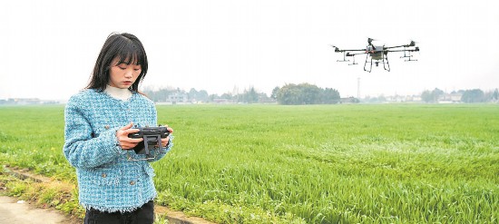 在隆興鎮黎壩村,崇州市楊柳土地股份合作社職業經理人王伶俐正熟練地操作無人機噴灑農藥,不一會兒工夫,就完成了好幾個田塊小麥的防治工作。