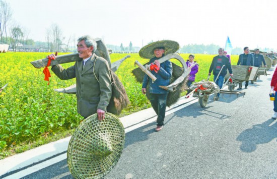 花橋鎮沖鋒村村民在油菜花海沿線展示傳統農具,讓游客在賞花的同時了解農耕文化。