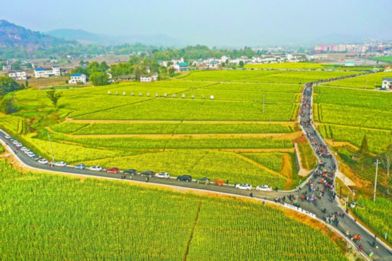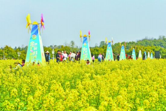 陽春三月,正是賞花好時節。在廣安區花橋鎮,萬畝油菜花盡情綻放,目之所及宛如一片金色海洋,將鄉村田園裝扮成一幅金燦燦的圖畫,吸引四面八方的游客前來踏春賞花,帶動鄉村旅游發展。 3月4日,“金色廣安·春歸花橋”2023年廣安花橋鎮首屆油菜花節開幕式暨賞花游樂活動舉行,游客們在現場觀看文藝演出,在花海中拍照打卡,在農博館體驗農耕文化,在農事服務中心、智慧糧油農場感受現代農業的魅力……一項項精彩紛呈的活動讓游客陶醉其中、流連忘返。 據介紹,“金色廣安·春歸花橋”油菜花節從3月4日持續至3月31日。節會期間,除舉辦歌舞表演、攝影展覽,以及打糍粑、捏面人等農耕文化體驗活動外,游客還可在園區內6大打卡點品嘗花橋美食、網紅茶飲等特色餐飲。