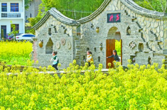孩子們在竹林村油菜花海中奔跑玩耍。