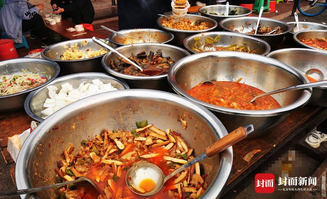 3月7日下午5點半,宜賓三江新區文博路兩邊的工地食堂已經聚集了不少大學生。幾家工地食堂面前擺放著桌子,桌子上蒜薹炒肉、紅燒茄子、火鍋魚、涼拌菜等裝在一個個盆里,大學生們三三兩兩圍在桌子面前選擇自己喜歡的菜品。